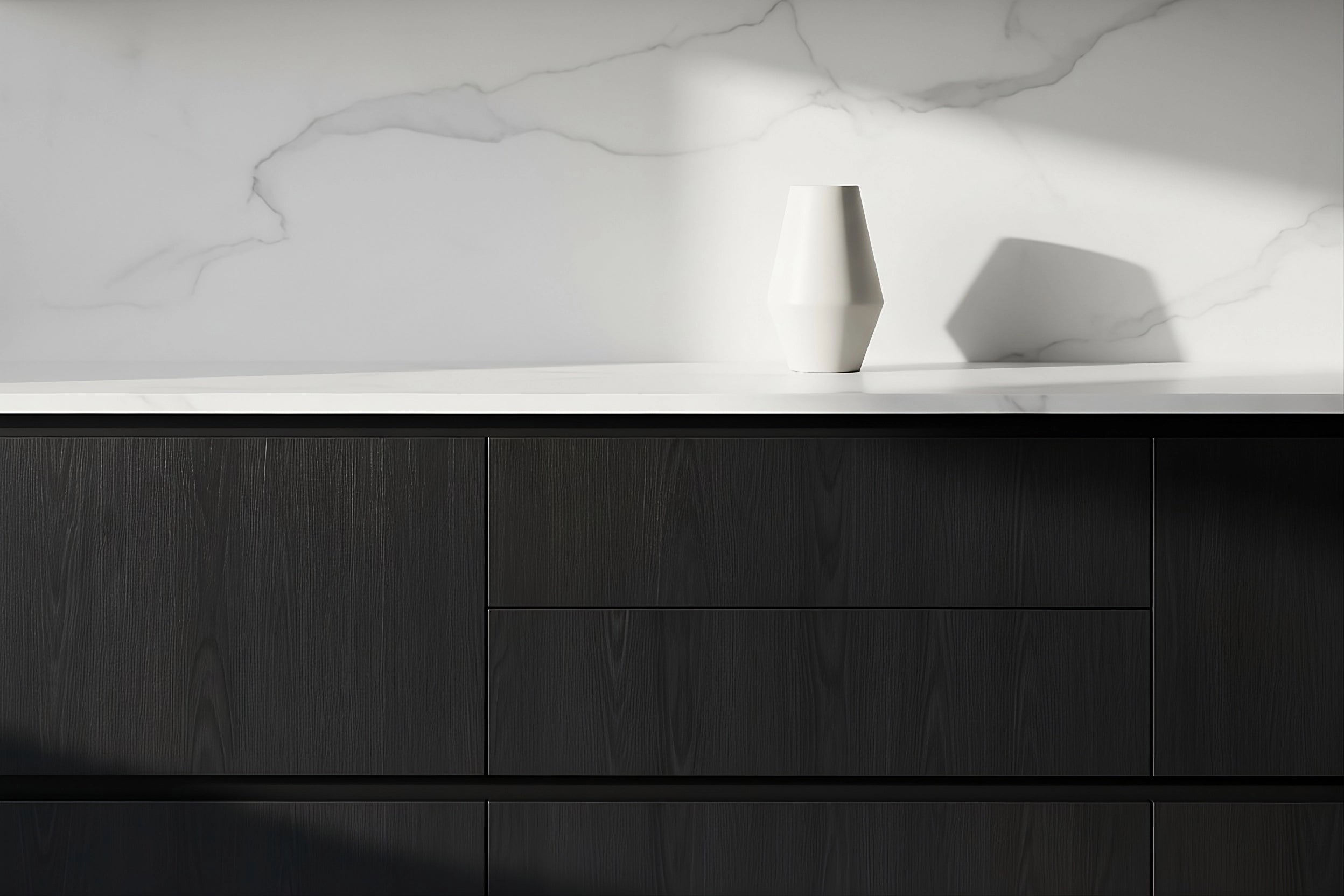 Under changing light, subtle variations appear, revealing depth and calm authority. Kuro Sumi brings refined strength to kitchens, joinery, and architectural spaces, creating an atmosphere of quiet elegance.